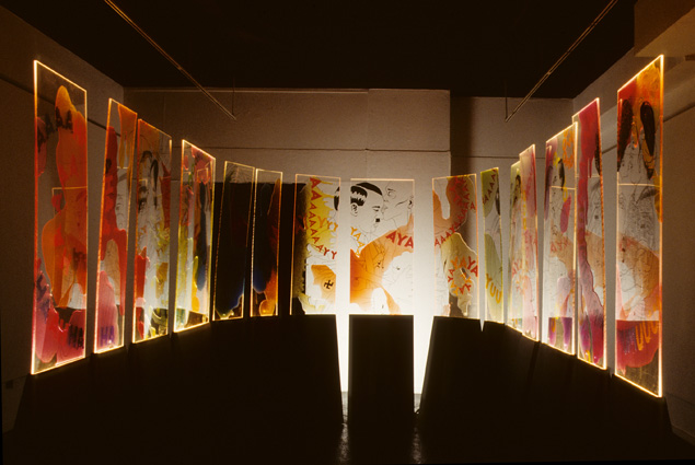 My Cathedral, (interior installation), 1997 Resin, enamel, colored film on plexiglass mounted in wood light stand Apse shaped 10' ht x 20' wd x 18' deep Soundscape featured Marisela Norte and Gabriel Romero