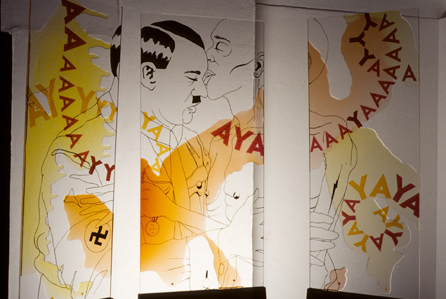 Adolf Hitler and Holocaust Survivor (interior installation) Detail, 1997 Resin, enamel, colored film on plexiglass mounted in wood light stand Apse shaped 10' ht x 20' wd x 18' deep