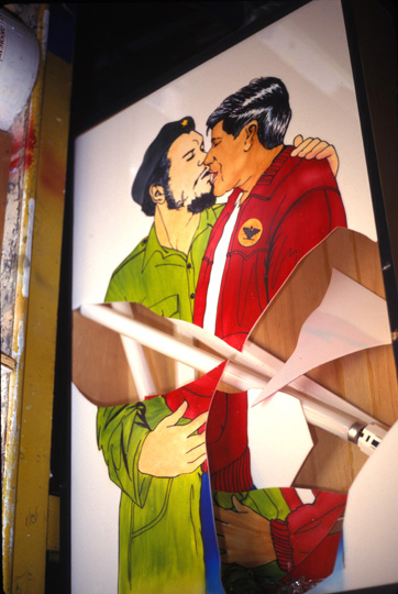The light-box “Che Guevara and Cesar Chavez” was the second artwork destroyed by an assailant during the third week of the “My Cathedral” exhibit at Galería de la Raza in the Mission District of San Francisco.