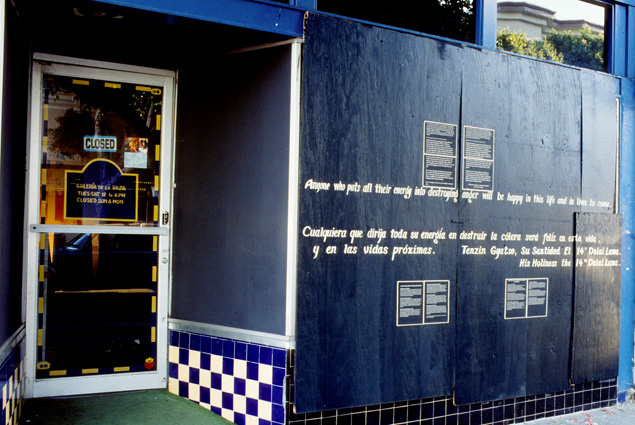The first artwork to be destroyed within two weeks of the “My Cathedral” exhibit opening was the painted light box “Jesus and Lord Rama.” Eventually gallery staff removed all the exterior light-boxes and exhibited them inside the gallery.