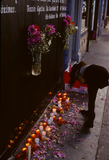 Passersby lit candles and wrote messages of tolerance with chalk onto the sidewalk in front of Galería de la Raza.