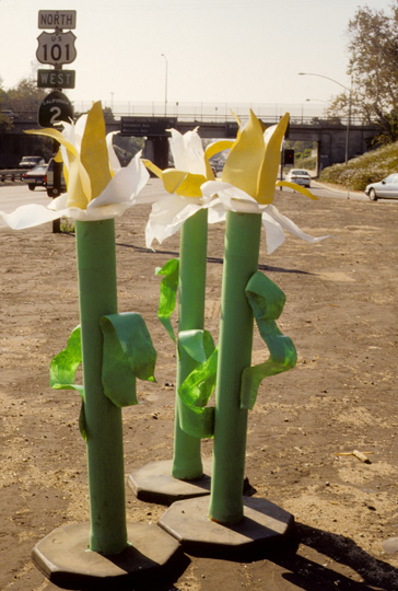 Beauty Happening, 1999 Public sculpture placed along 101 freeway Plastic, wire, and paint on street barrier Three flowers each approximately 48” x 16” diameter Nonextant