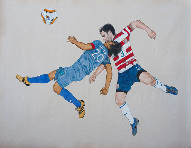 Guatemala vs USA (Carlos (El Pescadito) Ruiz & Carlos Bocanegra), 2014 Oil and acrylic on un-stretched canvas 60" x 84"