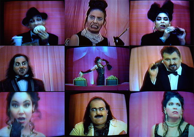 This multi-channel video presentation was first presented at Otis College of Art & Design then at Randolph Street Gallery, Chicago, IL.The videos presented campy Latino/Chicano couples in a tele-novela (soap opera) visit to a boxed-seat at the opera. Performers included Dionne d’Love, Danny Valenzuela, Yolanda Gonzalez, Willie Garcia, Sandra Ramirez, George Robles, Victor Durazo, Marcus Kuiland-Nazario and Elia Arce. |