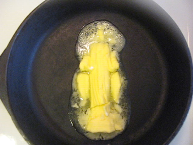 In this is video a small statue of the Virgin Mary cast in butter is placed in a frying pan and slowly melts away into a bubbling pool of oil. The video then goes in reverse and the statue reappears.