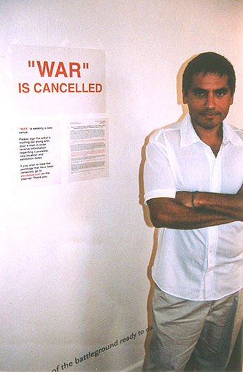 Donis stands before a sign reading “WAR is Cancelled” on Sunday September 23, 2011, the day his exhibit “WAR” was supposed to open to the public at the Watts Towers Arts Center gallery. The exhibit, featuring a painting series of fictionalized pairings of LAPD officers and gang members in same-sex dancing poses, was dismantled four days prior to the opening.
