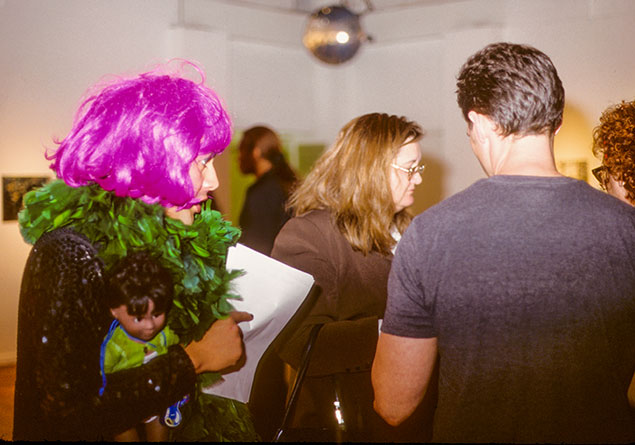 Artist and activist Marcus Kuiland-Nazario dressed in his drag persona ¡Carmen! hands out flyers to guests denouncing the “WAR” exhibit censorship during the evening festivities for the reopening of the Watts Towers Friday September 28, 2001.