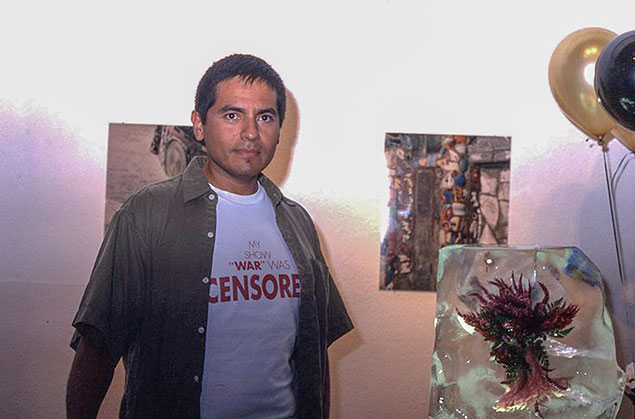 During the evening festivities for the reopening of the Watts Towers on Friday September 28, 2001, Donis hands out flyers denouncing the dismantling of his exhibit while wearing a t-shirt that states: “My Show WAR Was Censored”.